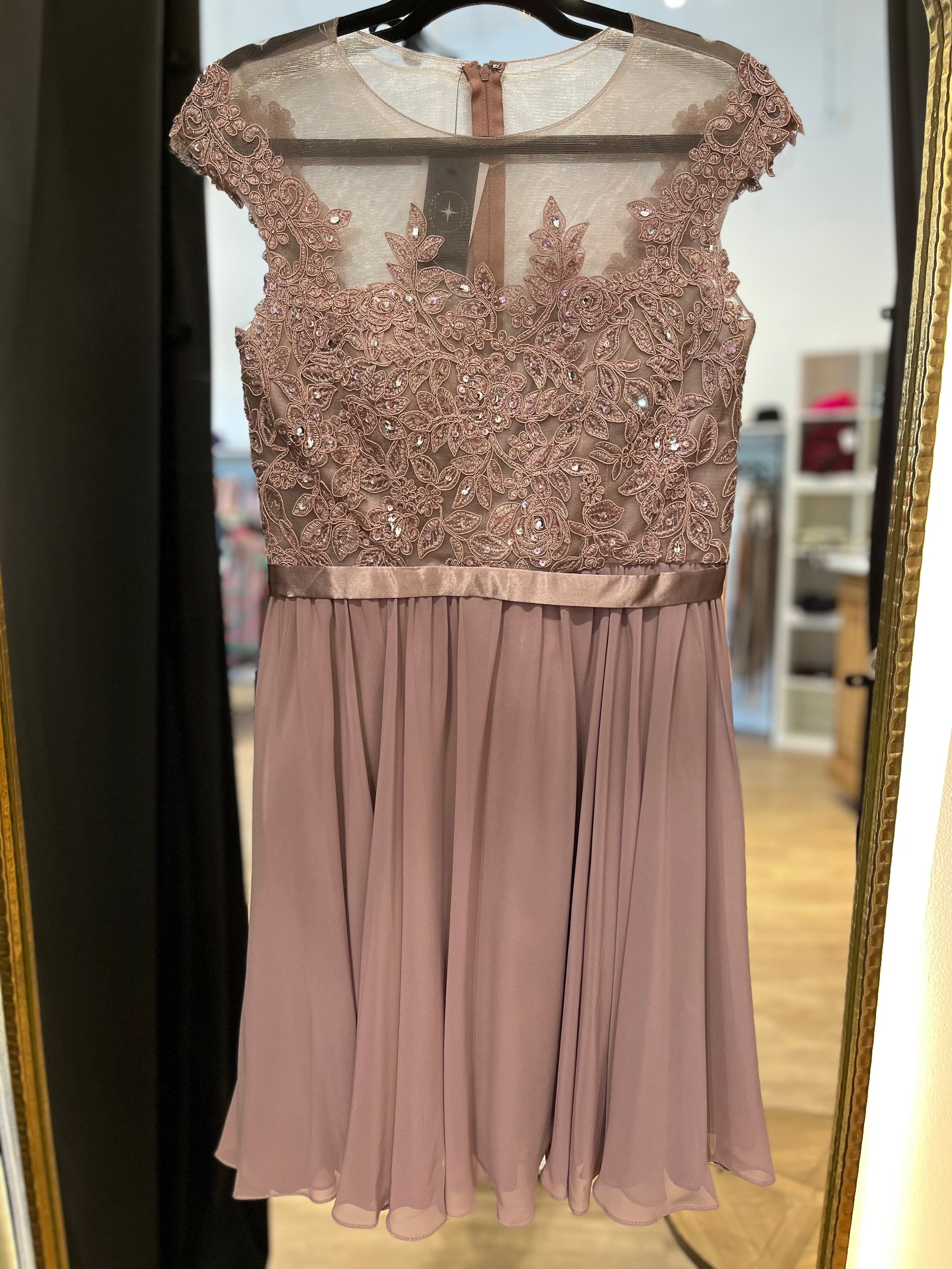 Indulge in luxury with the Avery Formal Dress. Crafted in a stunning mocha hue, this knee-length dress boasts delicate details on the top and comes with a shawl for added elegance. Designed for modesty, it includes bra padding for comfort and covers the shoulders. Make a statement at your next formal event with this exquisite dress!