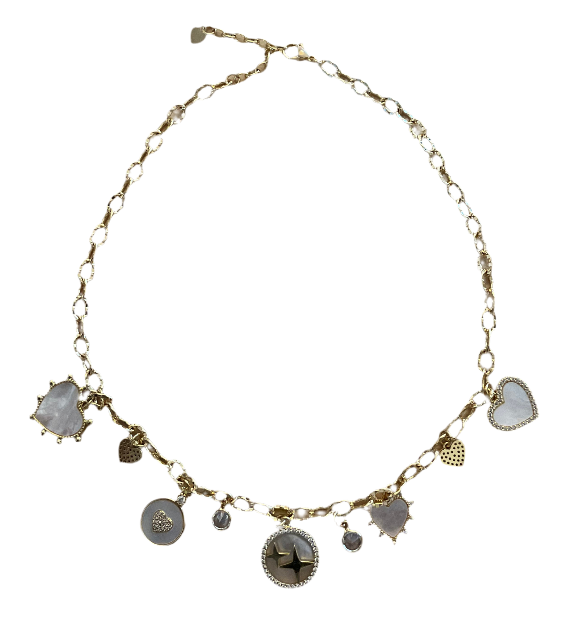 Two styles: First pictured - Adorned with a variety of intricate charms such as a cubic zirconia dragonfly, enamel butterfly, and cubic zirconia heart, this octagon chain necklace is a true statement piece. The cubic zirconia pearl cross, horseshoe, heart key, cherub, and butterfly charms create a harmonious blend of elegance and symbolism. Ideal for those who love to express their unique style through meaningful jewelry. Second pictured - Stars and hearts adorned with cubic zirconia and iridescent shell.