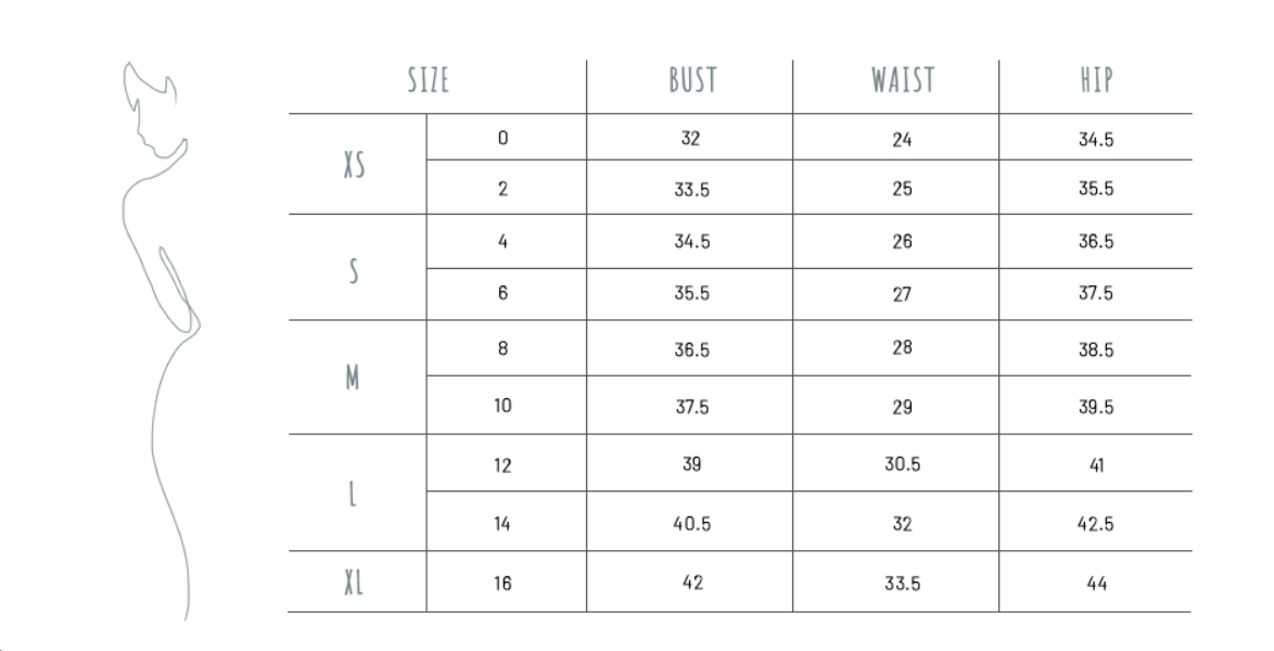 Size + Fit Model is 5'9.5" and wearing a size Small. See picture of size chart.