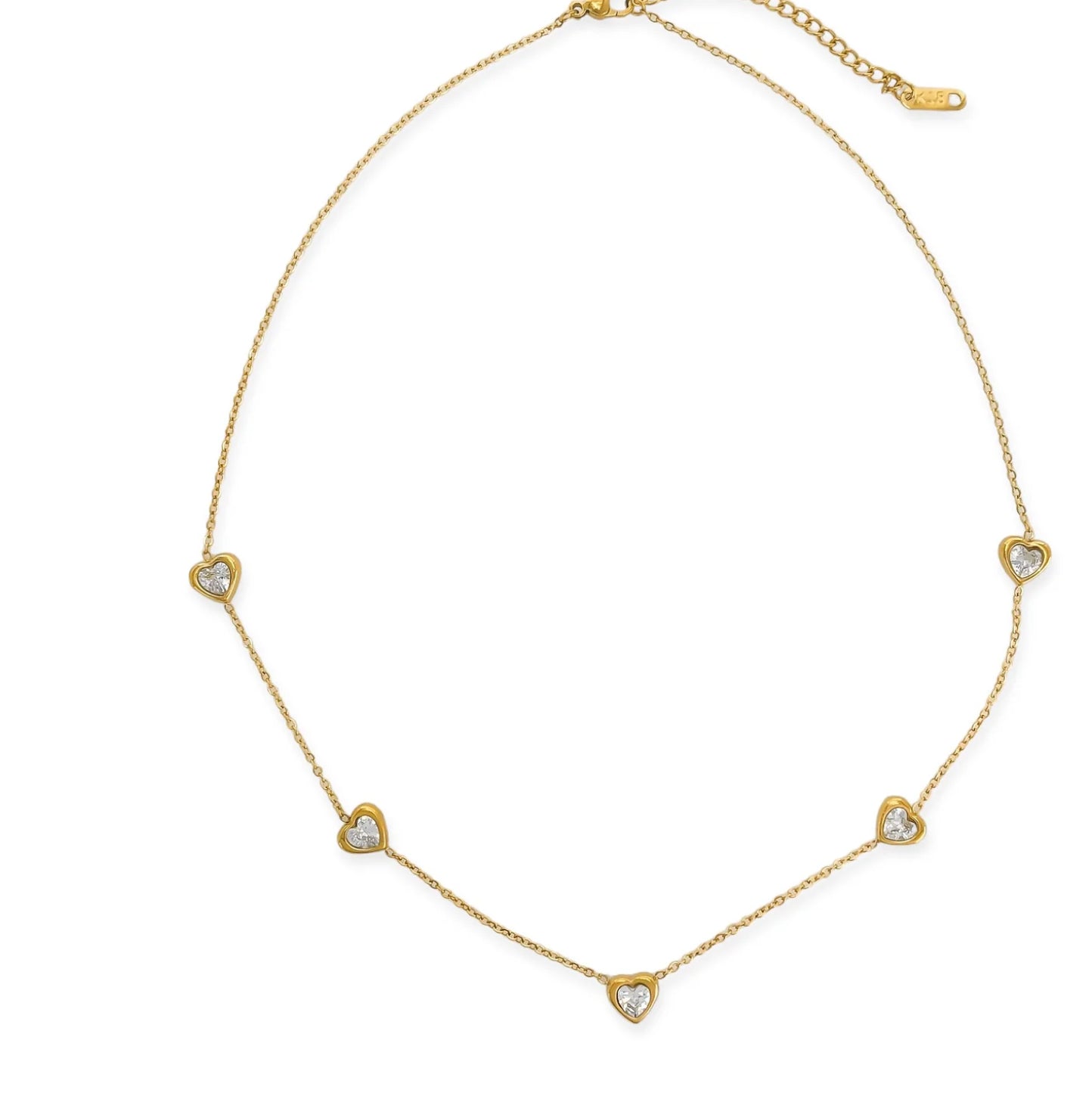 This lovely Water Resistant necklace blends intricate artistry with dazzling radiance. Skillfully crafted, it showcases five charming heart-shaped cubic zirconia stones, each carefully placed. A timeless accessory that effortlessly enhances any outfit.
