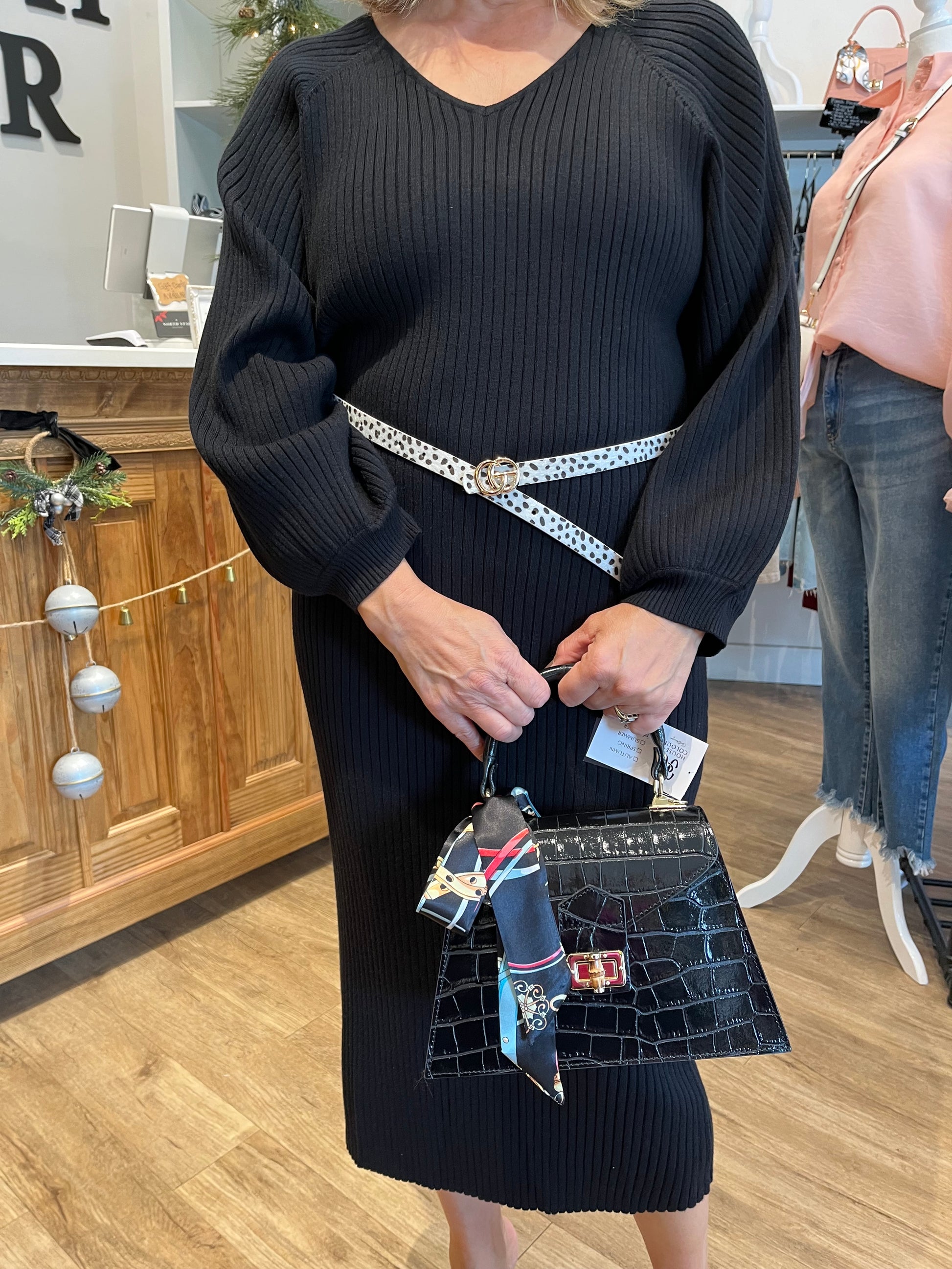 Indulge in luxury with the Romee- Black full-length ribbed sweater dress. Its elegant design boasts long balloon sleeves, a flattering v-neckline, and a timeless black color. Perfect for staying warm and stylish during the cooler months, this dress will become a staple in your wardrobe.